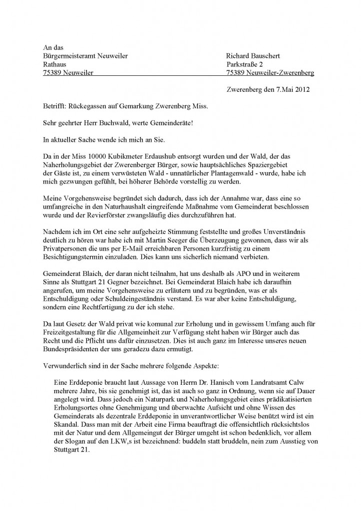 Zunächst wurde am 7. Mai 2012 beim Bürgermeisteramt Neuweiler eine Beschwerde eingereicht, die hier im folgenden wiedergegeben wird: