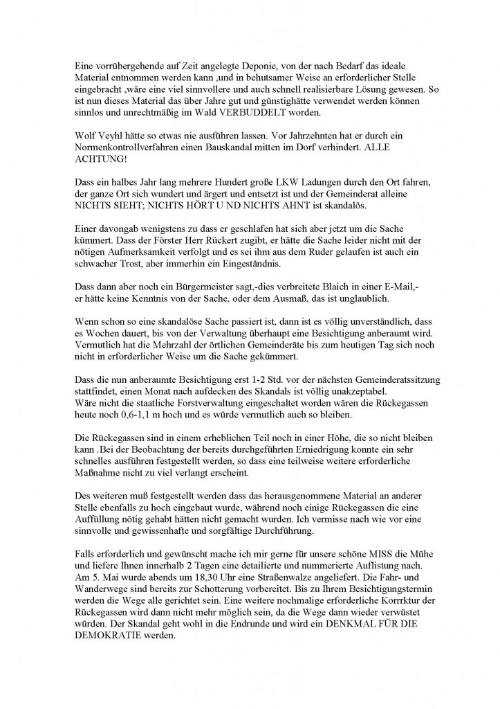 Dies geschah auch umgehend, jedoch keineswegs zufriedenstellend. Die Gassen wurden auf großenteils 60-80 cm zurückgebaut, indem ein Großteil des Materials einfach wie vom Schneepflug seitlich weggeschoben wurde und die Gassen somit um 1/3 breiter wurden. Dies veranlasste mich einen Brief an den Bürgermeister und die Gemeinderäte zu schreiben indem ich dazu aufforderte, die Rückegassen auf das zulässige Maß zu bringen und erst dann die total zerstörten Fuhr- und Wanderwege wieder zu richten. Der Bauausschuss hat dann Mitte Mai