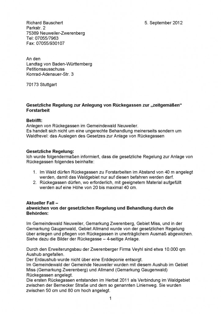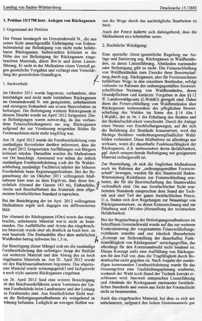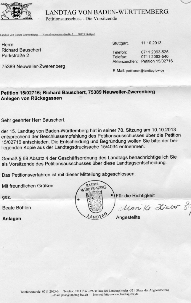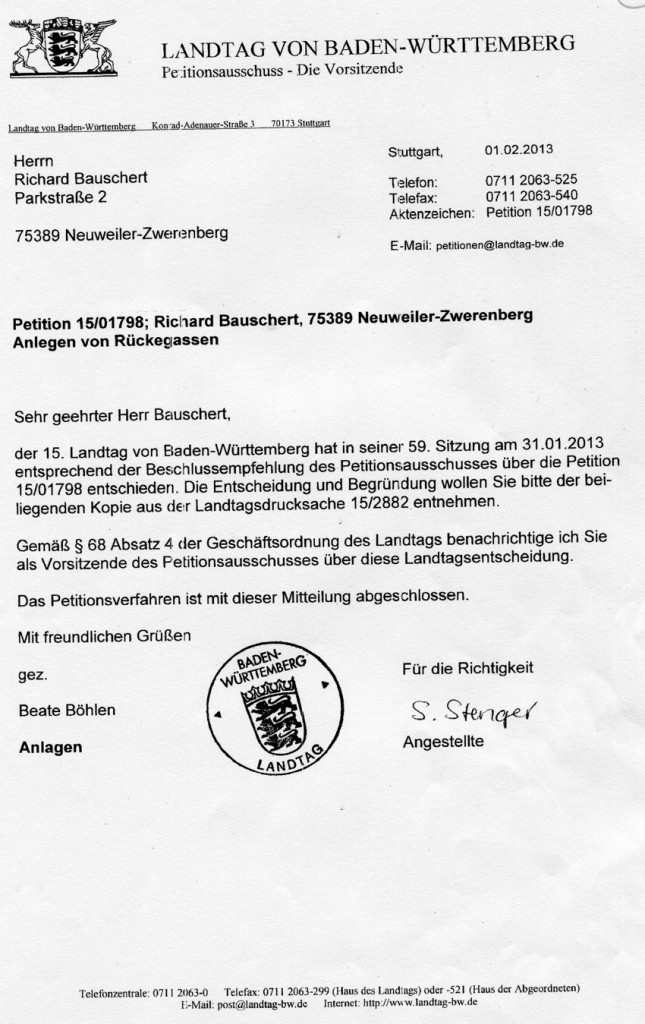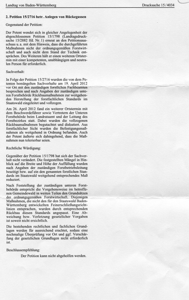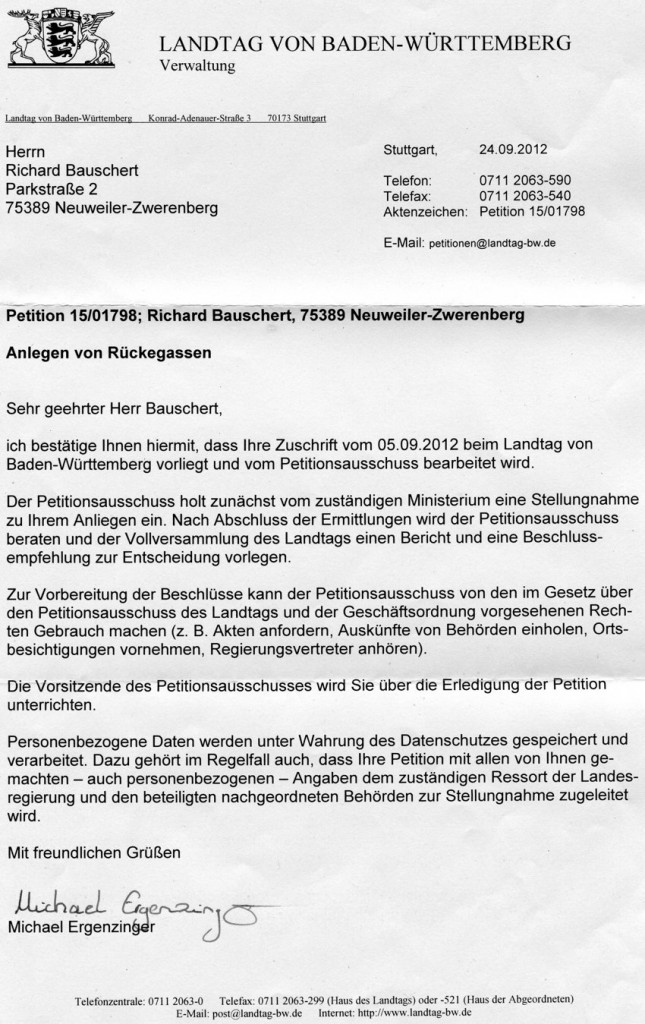 Schließlich blieb nichts anderes übrig, als am 5. September 2012 beim Petitionausschuß des Landtags eine Petition einzureichen, die ebenfalls hier dokumentiert wird: