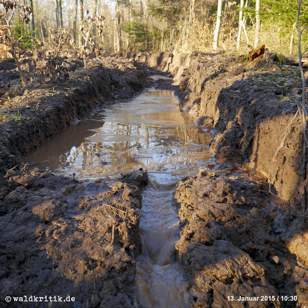 Die Fahrspuren halten das Wasser wunderbar, wie man auf dem Bild unschwer erkennen kann, denn der Waldboden wird nach unten hin perfekt verdichtet, sodaß in den nächsten 10 bis 20 Jahren sicher nichts passieren wird, in dem Sinne, daß der Boden wieder seine ursprünglich Lebenskraft zurückgewinnt.